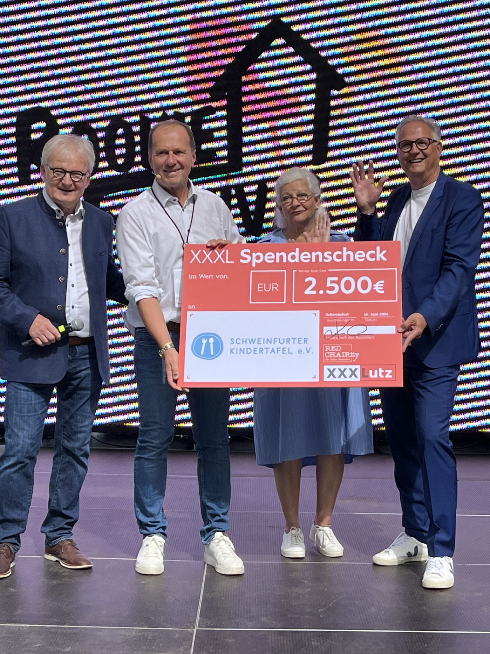 Schweinfurt. Ein ungewöhnlicher Ort für eine Spendenscheck-Übergabe: Die Schweinfurter Kindertafel, vertreten durch den Vorsitzenden Stefan Labus und Botschafter Peter Kruse, erhielt auf einer Seebühne vom CEO XXXLutz Deutschland, Alois Kobler, einen Spendenscheck über 2.500 Euro.