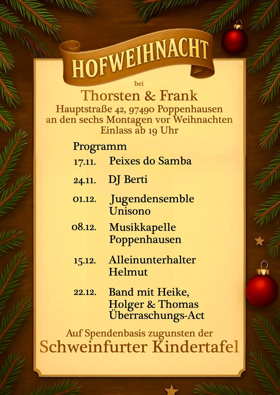 An jedem Montag in der Vorweihnachtszeit öffnen die beiden ihren Hof und heißen Freunde, Bekannte und Unterstützer willkommen. Bei Glühwein, Lichterschein und gemütlicher Atmosphäre darf gemeinsam gefeiert, gelacht und geholfen werden – denn der Erlös der Aktion kommt der Schweinfurter Kindertafel zugute.